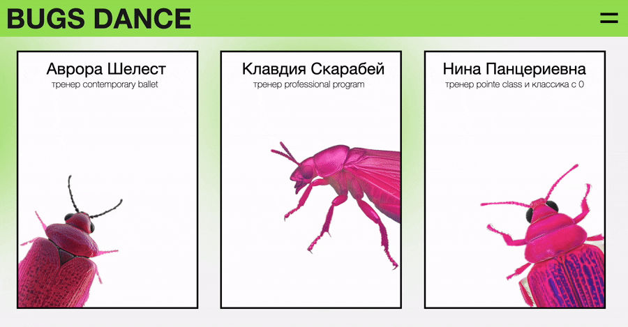 BUGS DANCE — это единственная в мире школа балета, в которой шестиногие могут стать балеринами, несмотряёт на количество лапок и индивидуальные особенности организма, а именно количество лап, глаз, усиков